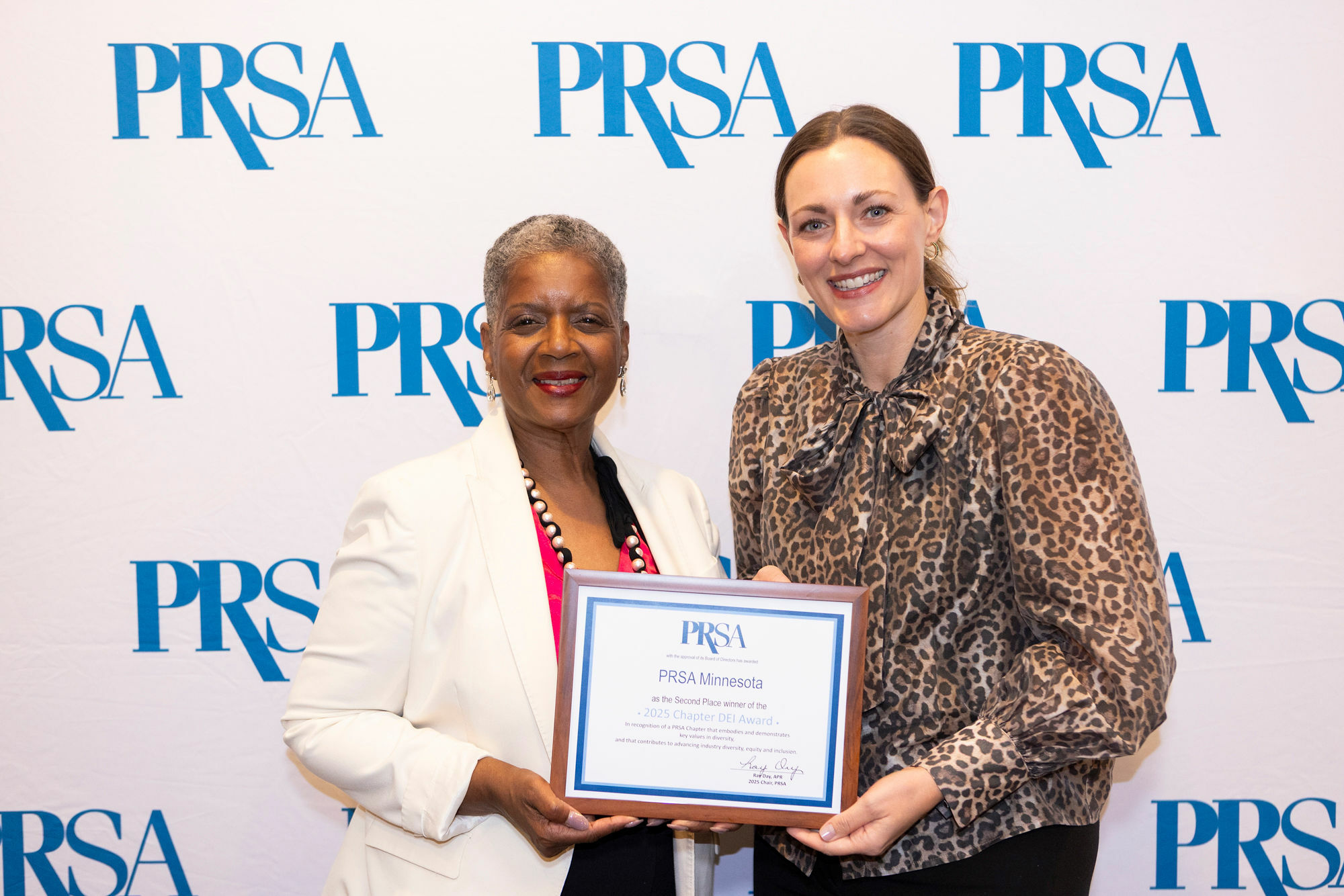 Congratulations to the Minnesota chapter for its strategic diversity, equity and inclusion initiatives and programming receiving second place honors in the PRSA Chapter Diversity Awards. Immediate Past President and 2020 D. Parke Gibson Pioneer Award recipient Marsha Pitts-Phillips, APR, and Treasurer/Secretary Emily Tackaberry, APR, accepted the award on behalf of the chapter on October 29 during the Diversity, Equity and Inclusion Celebration at ICON.