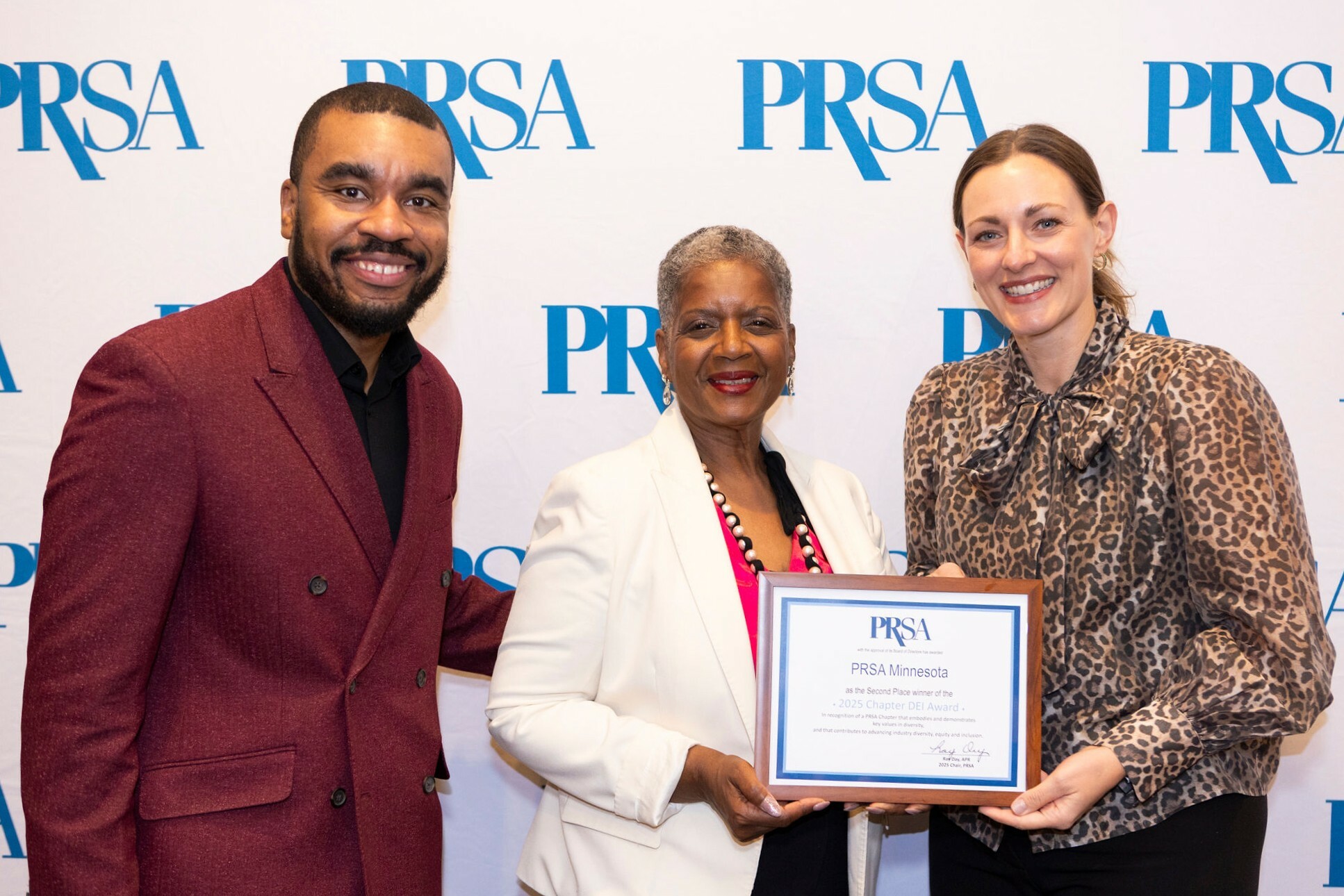 Minnesota PRSA President Ben Saukko, APR, MBA, accepted the award for the Chapter at the DEI Reception at the PRSA 2023 ICON in Nashville on October 16. Presenting the award were Marsha Pitts-Phillips, APR, PRSA DEI Committee Co-Chair and Minnesota PRSA President-Elect, and W. Patrick McSweeney, APR, Fellow PRSA, PRSA DEI Committee Co-Chair.