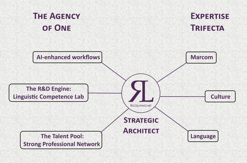 For my own practice, this Trifecta operates at the high-stakes intersection of marcom, language and culture. Specialized services, such as Conversational Spanish Coaching, are not side-hustles; they function as a Linguistic Competence Lab. This R&D arm ensures that multicultural marketing at RicoLatino remains nuanced and authentic, avoiding the pitfalls of surface-level translation. Even pro bono work adds to this dimension.